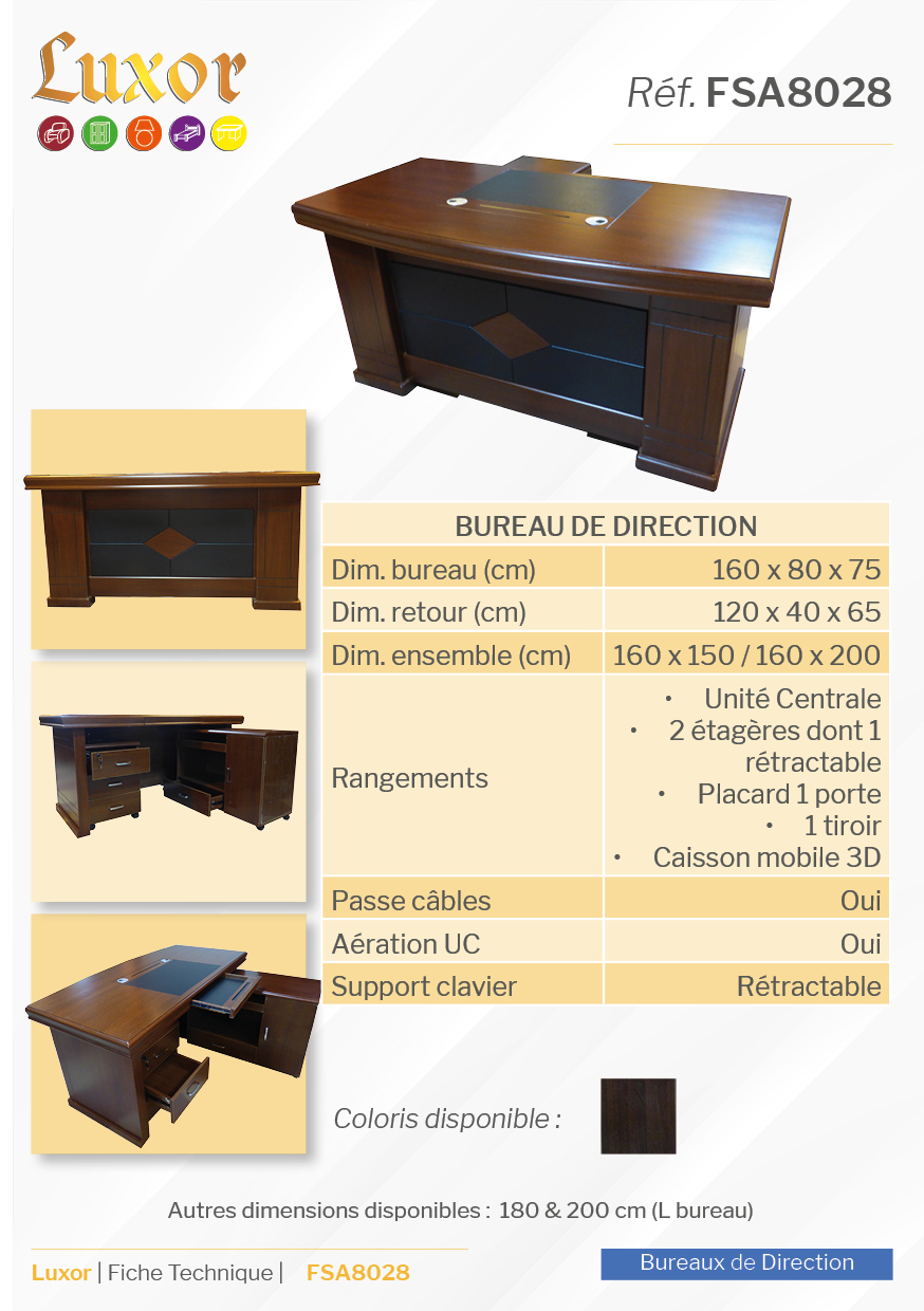 Bureau de direction 1600 x 800 x 760 mm avec rangement 3D 400 x 430 x 560 mm et retour 1200 x 400 x 650 mm.